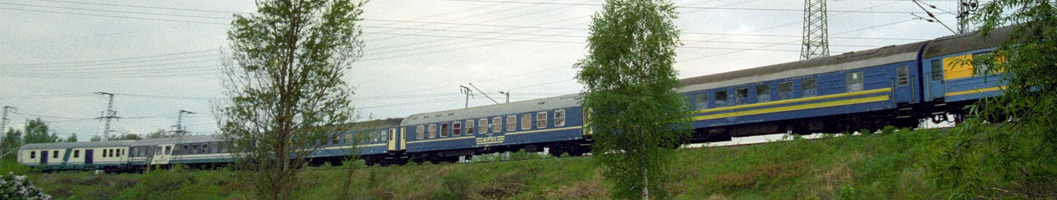 Вот это тоже очень интересная версия "Кафешантана": до Киева всего три вагона, из которых РИЦ КВР Быдгощь (с бело-салатным интерьером) пока только один, остальные - ещё олимпийцы. С 2004 года киевских вагонов станет пять, и они все будут со следами творчества Быдгощи, а эти олимпийцы поедут в "Тисе", в то время как освобождённые оттуда корыта 73/76 года × ДВРЗ со сдвижными дверями купе на время пойдут под забор. А вот ВБС в Харьков и Симферополь до самого последнего поезда ходили на латанных-перелатанных олимпийцах.