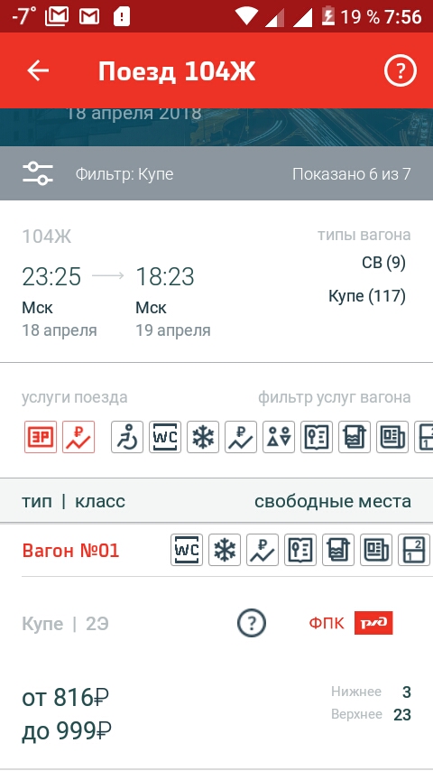 При этом плата за услуги в этом поезде 698 рублей. Получается собственно стоимость проезда на верхней полке от Краснодара до Москвы 118 рублей.VOLGOGRAD613: На 18 апреля на 104 поезд из Краснодара в Москву верхние полки сейчас стоят 816 рублей.