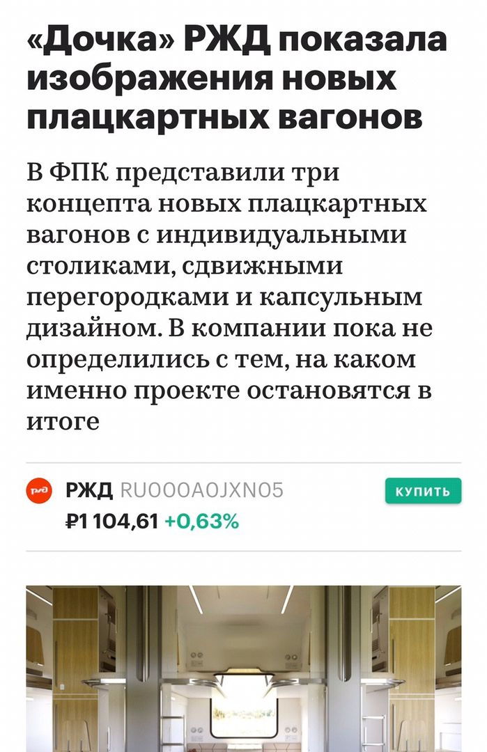 Какой годовой давности? Вагон(ы) плацкарт со шторками выпущен в этом году Тамбовским ВРЗ и катается где-то в поездах. Кто будет выпускать остальные прототипы-точно на 100% скажут (или нет?) в пресс-службе ФПК .Я имел в виду не обновление годовой давности, а те три концепта, о которых сейчас заговорили. Это новые вагоны или переделка старых?