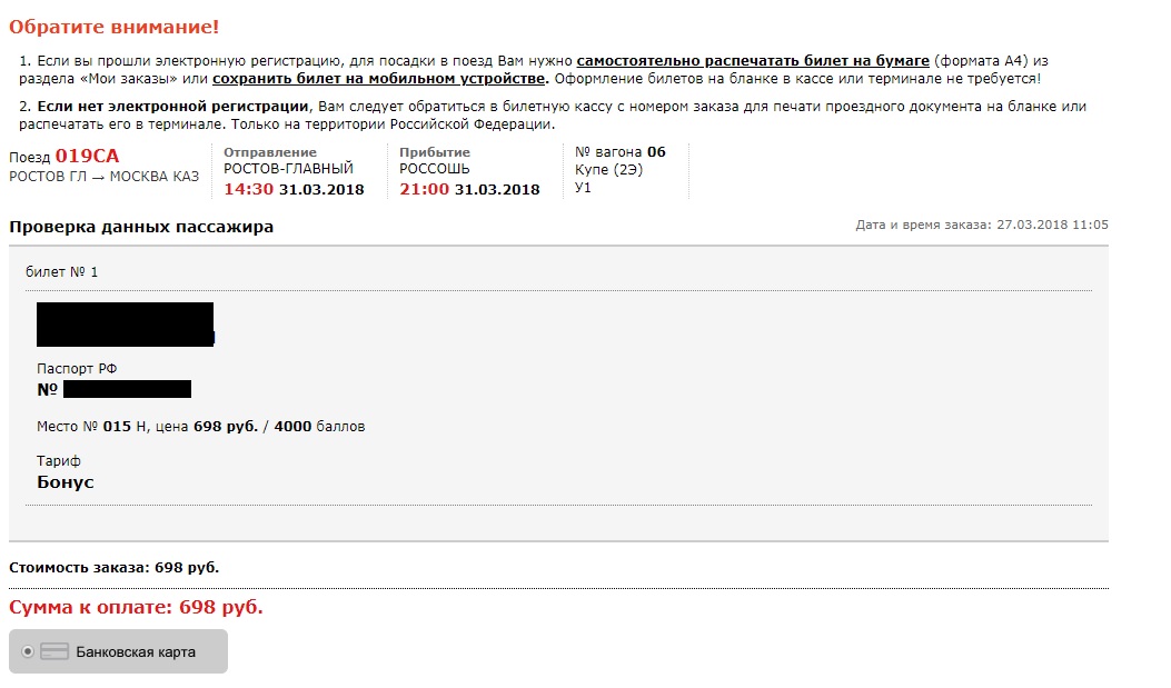 Compden-railman: Если покупать билет в купе от Москвы до Анапы на поезд 11/12, то спишется 12000 баллов. А если купить билет Москва - Ростов, то спишется 7000 баллов, и на это же место купить билет Ростов - Анапа, то спишется 4000 баллов, итого 11000 баллов, меньше на 1000 баллов, чем при покупке прямого билета без «разрыва» по Ростову. Только придётся оба раза оплатить стоимость пользования постельным бельём, но это около 300 руб., не трагедия, зато экономится аж 1000 баллов !