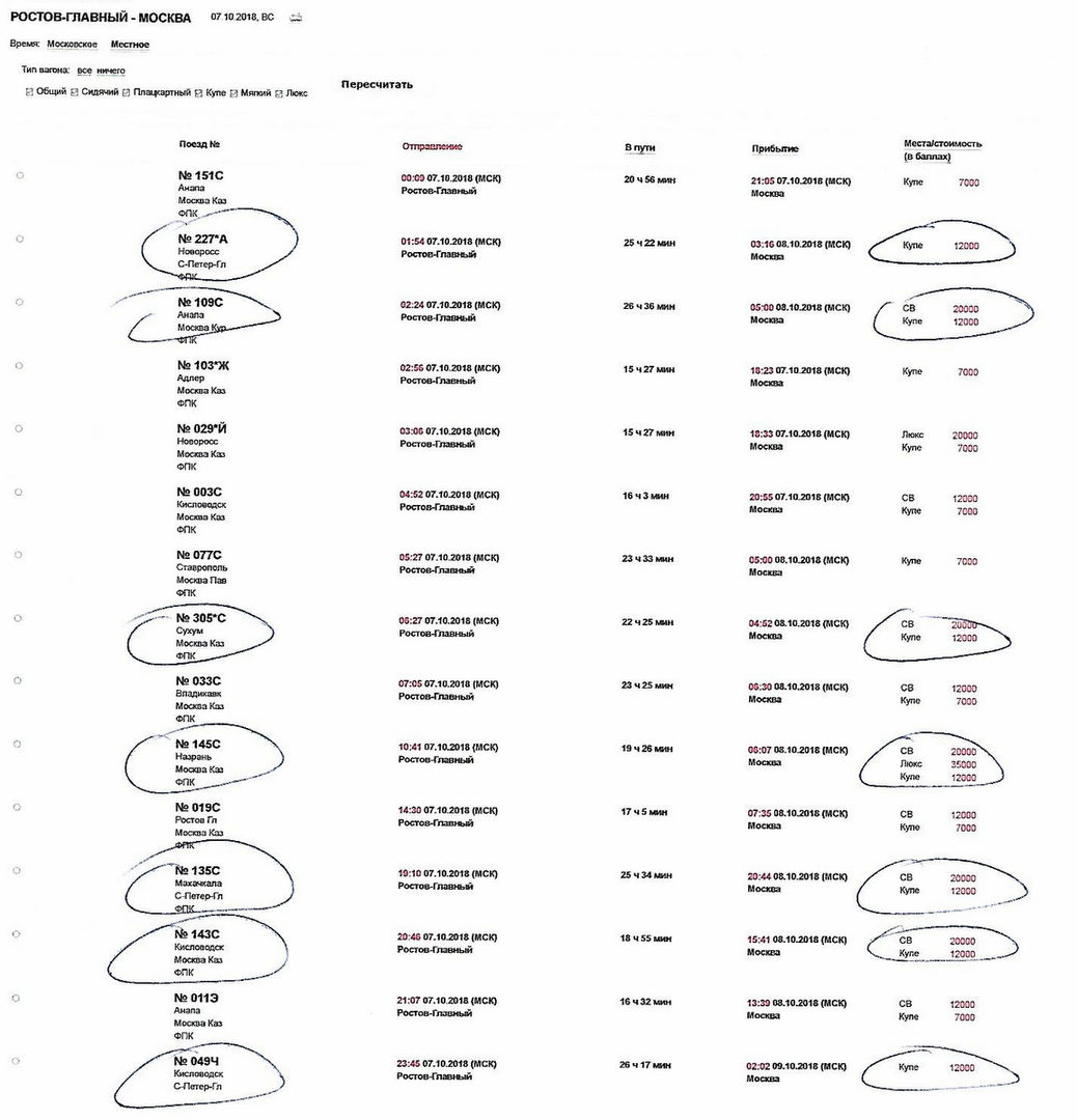 К сведению отдыхающих: при оформлении премиальных билетов на направлении Ростов-на-Дону - Москва будьте осторожны. Почти половина поездов требуют отдать за купе вместо семи (7000) двенадцать (12000) тысяч баллов! Там расстояние на несколько километров отличается. Кстати, кто-нибудь помнит, как до строительства "обхода Украины" было?