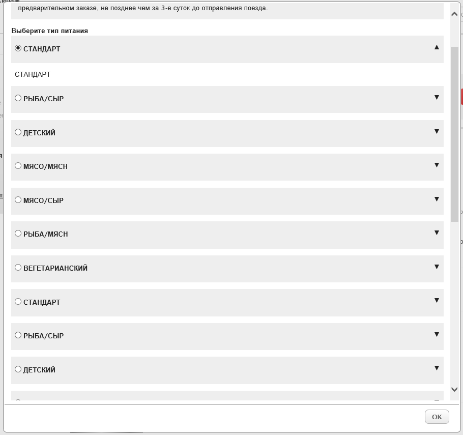 ФПКшная еда (дополнительная) заказывается после подтверждения бронирования (Ввод информации о пассажире и выбор мест -> Подтверждение -> Выбор доп. услуг (багаж, доп. питание, ...) -> Оплата).Если билет изначально куплен без доп. питания, то вроде бы можно зайти в мои заказы и заказать к этому билету доп. питание.serg:А где, в каком месте и на каком этапе можно заказать питание? Естественно, при условии отсутствия в категории вагона опции "У1".кассир: Я тоже поюзала, прикольно.))) Мне на М- Лазаревская 83й поезд, предлагают подвезти еду в Орел, Курск, Воронеж, Россошь и Ростов. Может, и закажу пиццу. Я ж ничем не рискую, оплата налом курьеру...