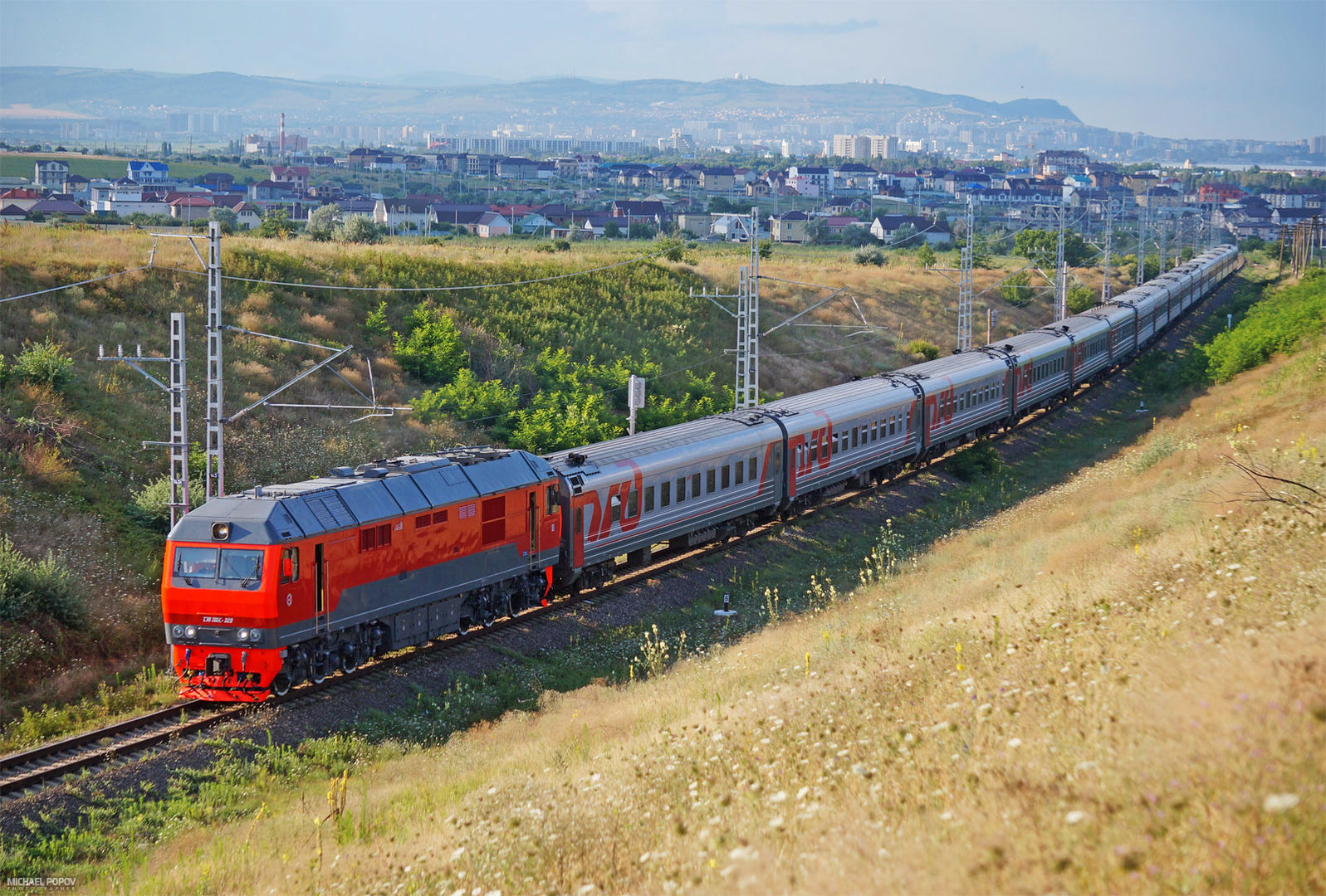Тепловозы ТЭП70БС в серо-красно-оранжевой ливрее. Станция Анапа и перегон Анапа-Гостагаевская. Июль 2019 г.