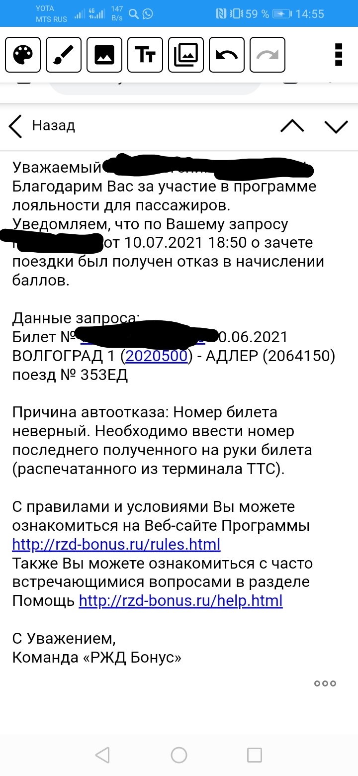 Попробовал зачесть поездку ещё раз. Опять автоотказ. Позвонил на горячую линию. Там сказали что нужен именно номер бланка из терминала. Который естественно отличается от номера электронного билета.DIWIN:Разве номера билетов из терминала и приложения разные?VOLGOGRAD613: Не пришли баллы за несколько поездок. Попробовал зачесть поездки в ретро режиме. Сразу отказ. Оказывается теперь нужно обязательно вносить номер распечатанного в терминале билета. Который давно выкинут. Потому что раньше было достаточно указать номер из приложения. Что делать теперь непонятно. Баллов там много должно было прийти. В автоматическом режиме похоже уже ничего не придёт.