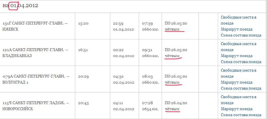 Еще кстати забавно, когда два поезда чередуются по четным/нечетным, то возникают в таких случаях дни, когда нет ни одного из них