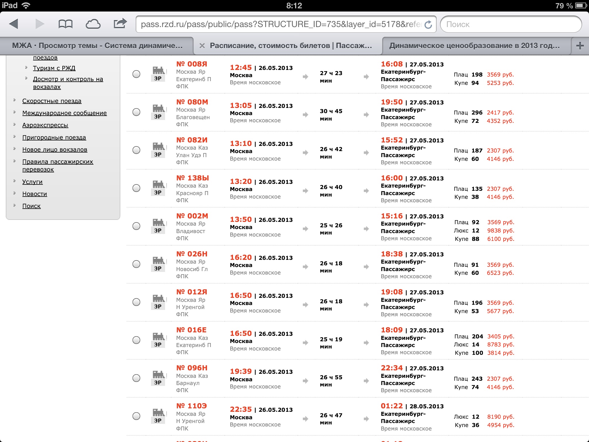 Теперь выводы с картинками: театр абсурда продолжается. На все направления нефирменный стоит дороже фирменного, в Адлер 12-й стоит дороже 102-го, в Екб 8-й стоит дороже 16-го. В Казань скотовоз 50-й дороже премиума. Москва-Адлер плацкарт дороже купе. Где здесь логика мне совсем непонятно. Смотрим скриншоты