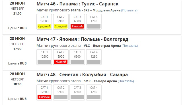 Когда я попал, то отображалось достаточно много матчей с 4-й категорией, даже в Сочи, но реально купить ничего не получалось, постоянно выдавалась ошибка. В итоге купил только на одну игру в Волгограде. ::-(: