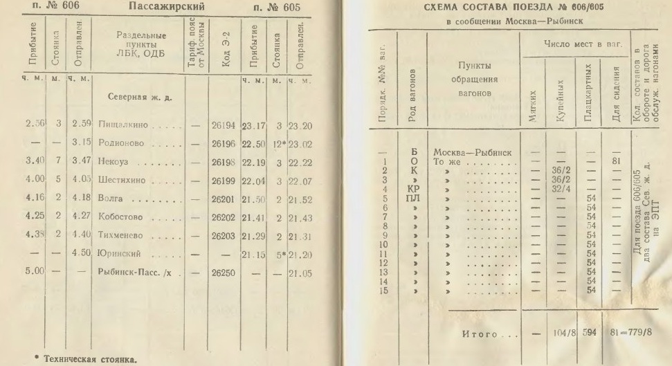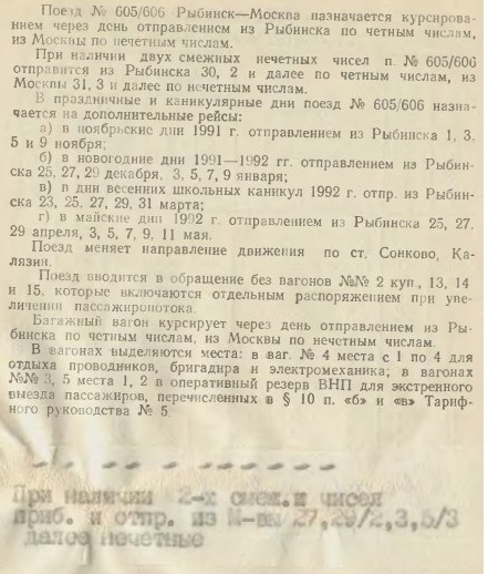 1991 год служебное расписание поезда № 606Д/605Д Москва-Рыбинск