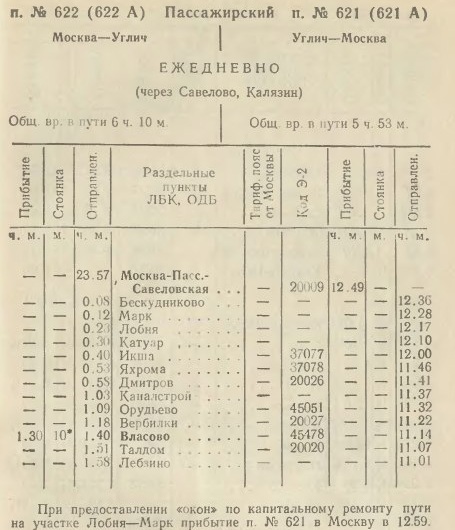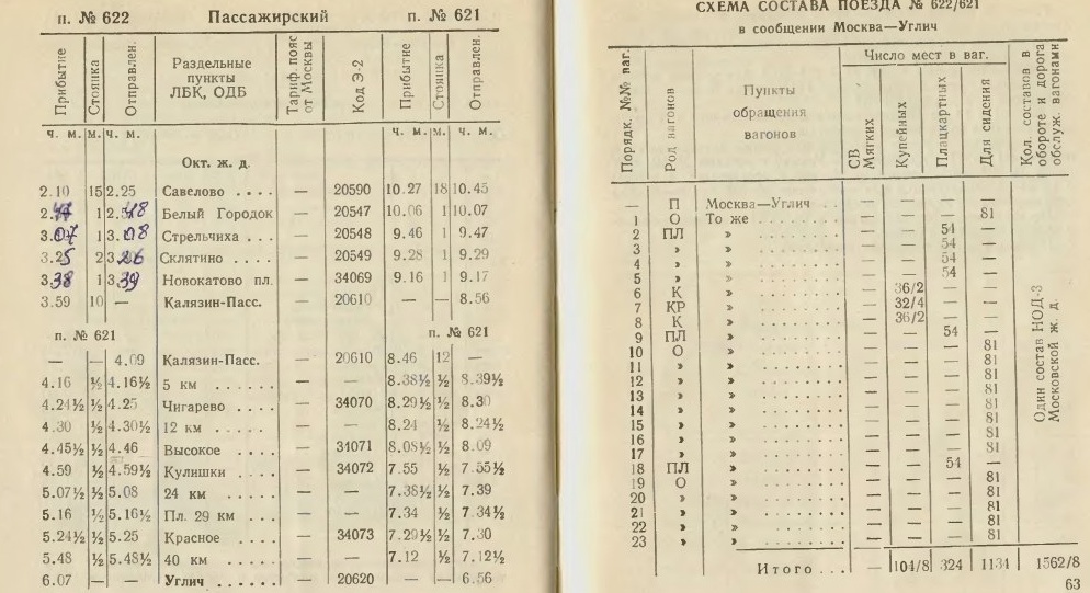 1991 год служебное расписание поезда № 622А/621А Москва-Углич