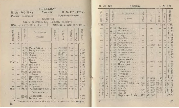 1994 год служебное расписание поезда № 126Х/125Х "Шексна" Москва-Череповец