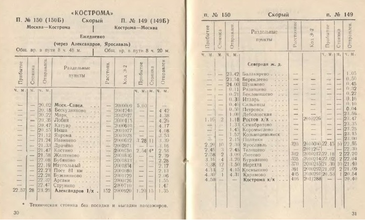 1994 год служебное расписание поезда № 150Б/149Б "Кострома" Москва-Кострома