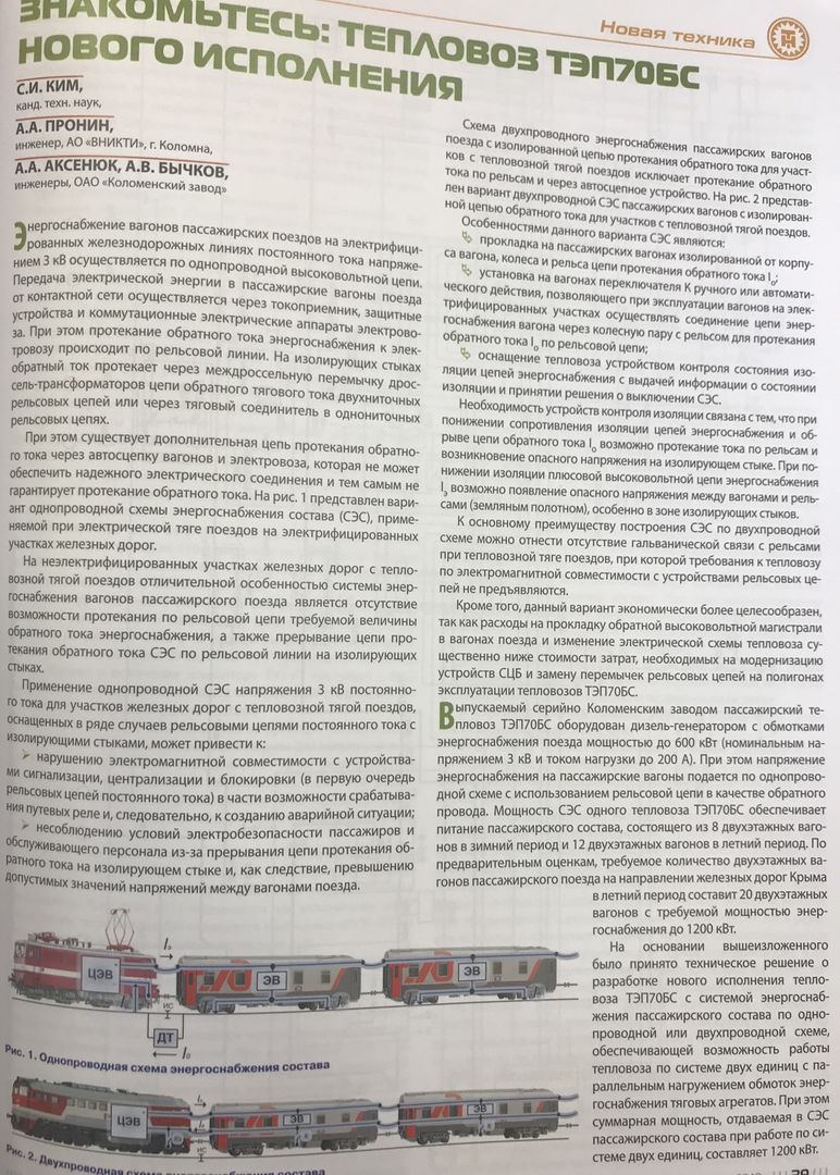 Кроме того, данный вариант экономически более целесообразен, так как расходы на прокладку обратной высоковольтной магистрали в вагонах поезда и изменение электрической схемы тепловоза существенно ниже стоимости затрат, необходимых на модернизацию устройств СЦБ и замену перемычек рельсовых цепей на полигонах эксплуатации тепловозов ТЭП70БС.