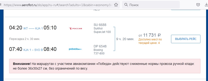 Аэрофлот с багажом? Пруф приведите.mvy:11500Михаил: Иркутск - Москва на 18 сентября в одну сторону 21400