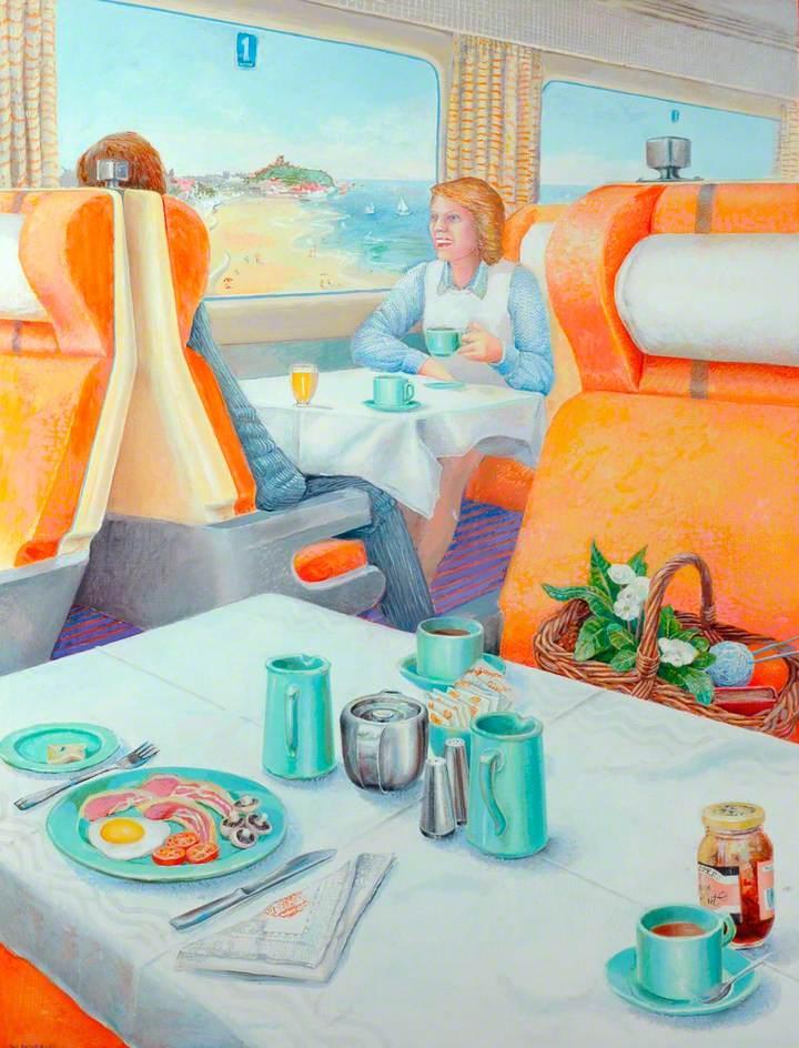 Val Archer "Interior of Restaurant Car with Diners Looking out over Beach" (1982)