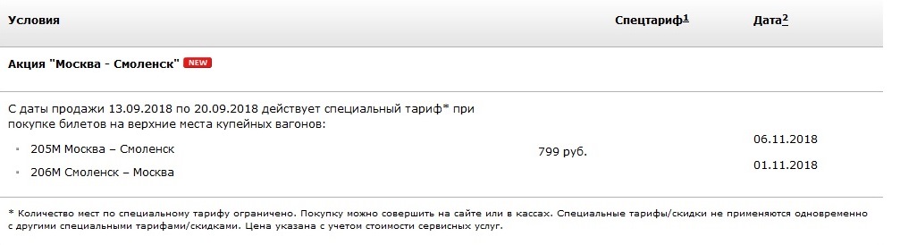 Разработчики акции, видимо, предполагают, что жители Смоленска с нетерпением ждали возможности доехать до Москвы за такие деньги в купе на верхней полке - ехать на Ласточке за меньшие деньги несерьезно... Ну и до кучи - мечтающему о такой поездке придется взять отгул на один день до праздников и один день после, так как 02 и 06 ноября рабочие дни.