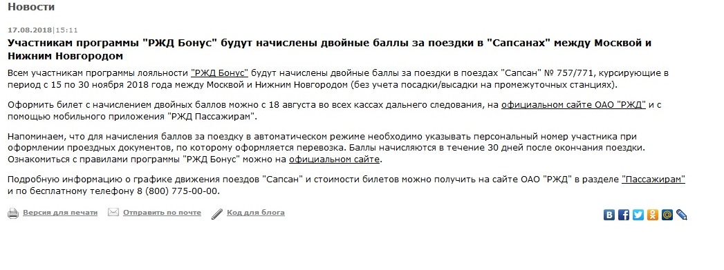 Скажу честно, видел информацию об этой акции пару недель назад, хотел сделать принтскин... и потратил минут десять на поиск информации об этой акции на сайте РЖД. Найти информацию об этой акции удалось только после запроса в Яндексе "Сапсан Нижний Новгород Двойные баллы".