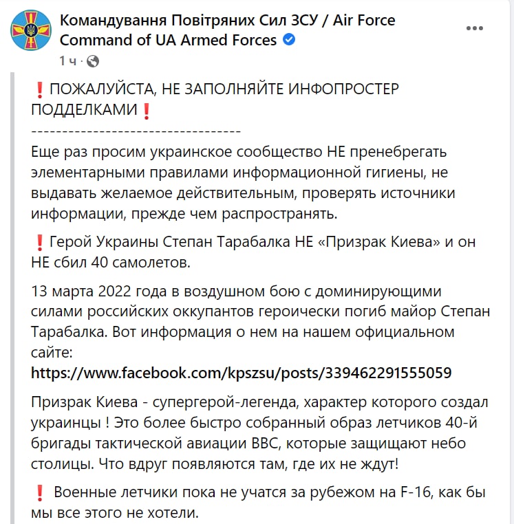 Командование ВВС Украины на официальной FB-странице (ссылка верифицирована в Википедии) признало, что "Призрак Киева" (про который многие писали) был духоподъемным враньем.