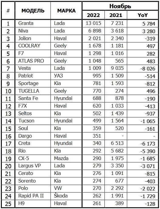 В ноябре 2022 года продажи новых автомобилей в России снизились на 62% относительно прошлого год, всего за последний месяц осени продано 46 403 автомобиля. Лидерству Lada Granta (13 015) и Lada Niva (6 898) ничего не угрожает, но китайские бренды постепенно заполняют верхнюю часть итоговой таблицы. В первой десятке уже пять китайских моделей, причем четыре из них идут сразу за Грантой и Нивой. Модели Hyundai и KIA продолжают миграцию в нижнюю часть, а также за пределы итоговой таблицы - централизованные поставки новых машин практически отсутствуют, локальное производство на заводах в Санкт-Петербурге и Калининграде остановлено, а складские запасы истощаются.