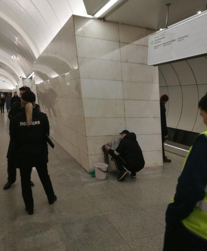 В Мосметро граффитчика заставили оттирать его т.н. «тэг-подпись» под присмотром полиции и работников метрополитена.