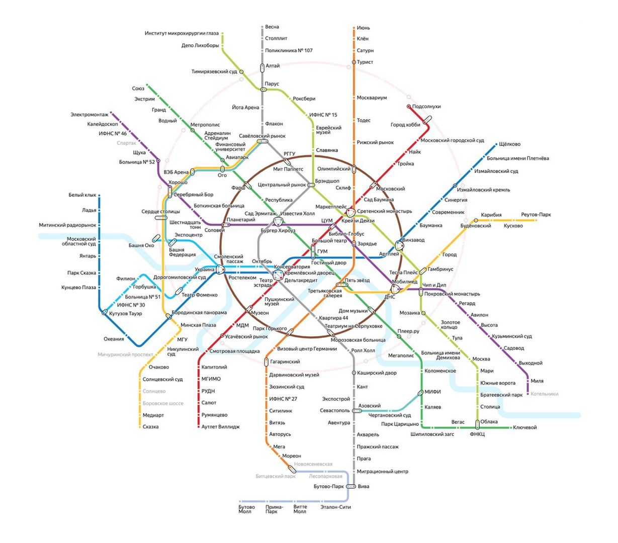 «Яндекс» проанализировал, что чаще всего ищут пользователи рядом с метро, и «переименовал» станции в соответствии с этими запросами. Например, карта московского метро выглядит так.