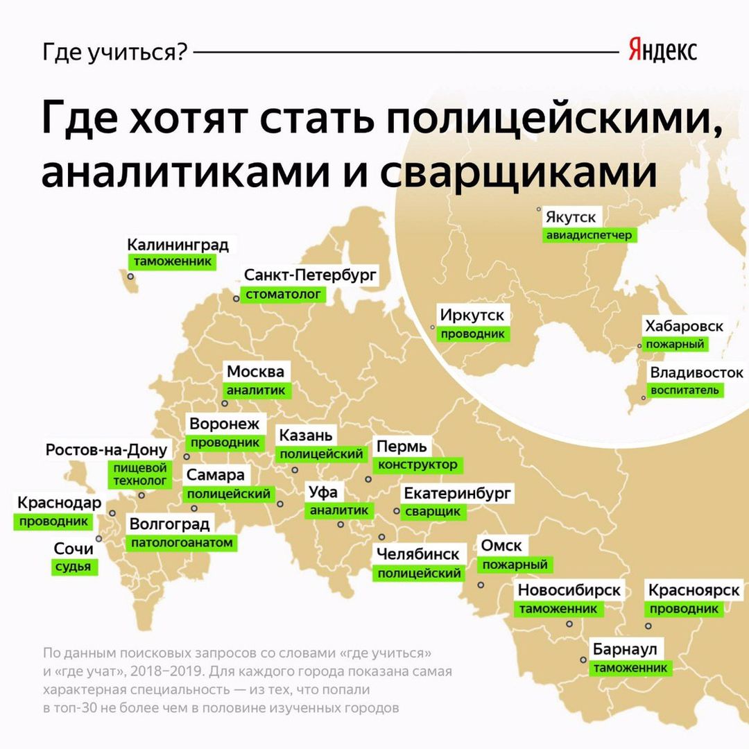 В Яндексе провели любопытное исследование: по поисковым запросам «где учат» и «где учиться» составили карту профессий, которыми интересуются в городах России. Для каждого города определили специальность, которой пользователи Интернета интересовались чаще всего.
