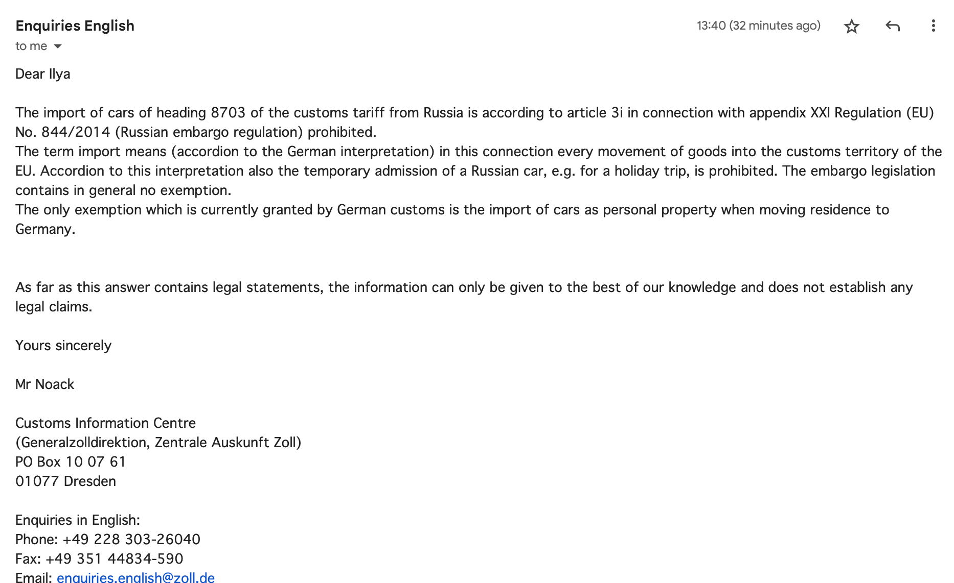 Во всех случаях таможенники ссылаются на регламент Совета (ЕС) № 833/2014 от 31 июля 2014 года, который опубликован на сайте немецкой таможни, и поправки от 7 октября 2022 года, так называемый восьмой пакет санкций. В них действительно есть запрет на ввоз в ЕС из России товаров, которые «приносят России значительный доход» (здесь он на русском), в том числе личных автомобилей, но ранее эта норма не применялась в Германии и Европе.