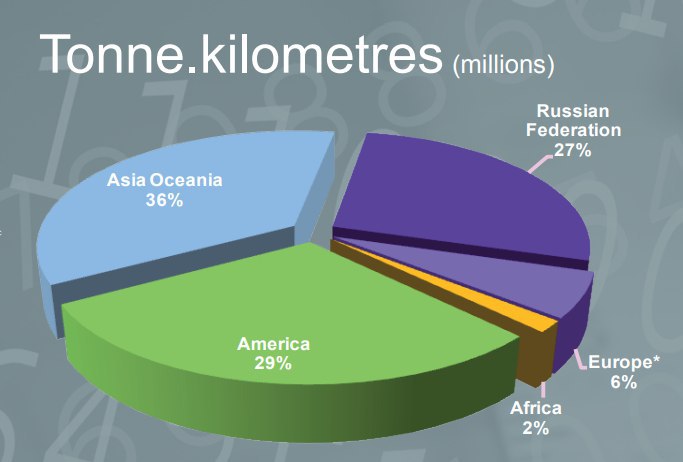 Интересная инфографика от Международного союза железных дорог (UIC): доля по протяженности ж/д линий и по объемам перевозок - в тоннокилометрах и пассажирокилометрах. Правда, данные за 2015 год, но тут вряд ли что-то принципиально изменилось.