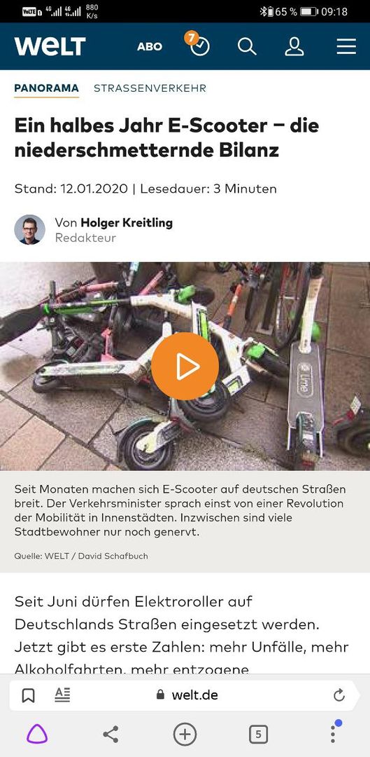 Германия подводит неутешительные итоги полугодовой жизни электро скутеров в правом поле. Средний портрет: бухой неуравновешенный придурок, без защитной сбруи и катафотов. Если бы аналогичная скутерам аварийность случилась бы с автомобилями - четверть немцев находилось бы в больнице или на кладбище