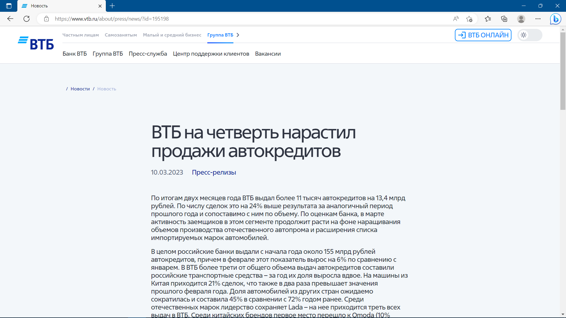 ВТБ на четверть нарастил продажи автокредитов10.03.2023