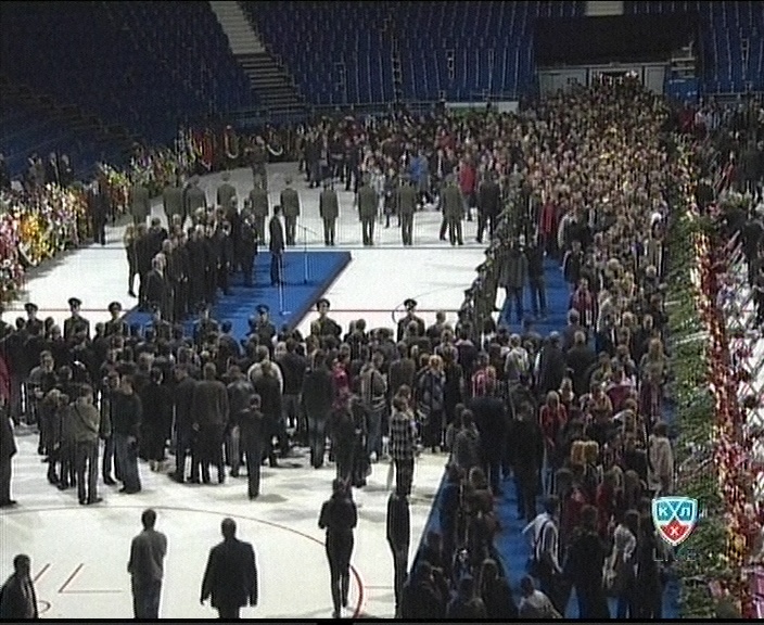 Сегодня в ледовом дворце "Арена-2000" в Ярославле состоялась траурная церемония прощания с погибшими игроками хоккейного клуба "Локомотив". Почтить память погибших спортсменов в Ярославль приехала делегация ОАО "РЖД" во главе с президентом компании Владимиром Якуниным.