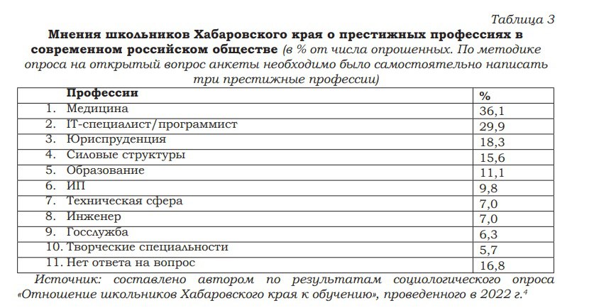 Ещё интересное социсследование в Хабаровском крае – какую специальность подростки 8-11 классов считают престижной. Опрос от середины 2022 года (Дальневосточный институт управления – филиал РАНХиГС), когда уже шла СВО, и власти вдруг обнаружили, что стране не хватает рабочих и инженеров. Это подтверждали и опросы, которые в этой работе приводят социологи: