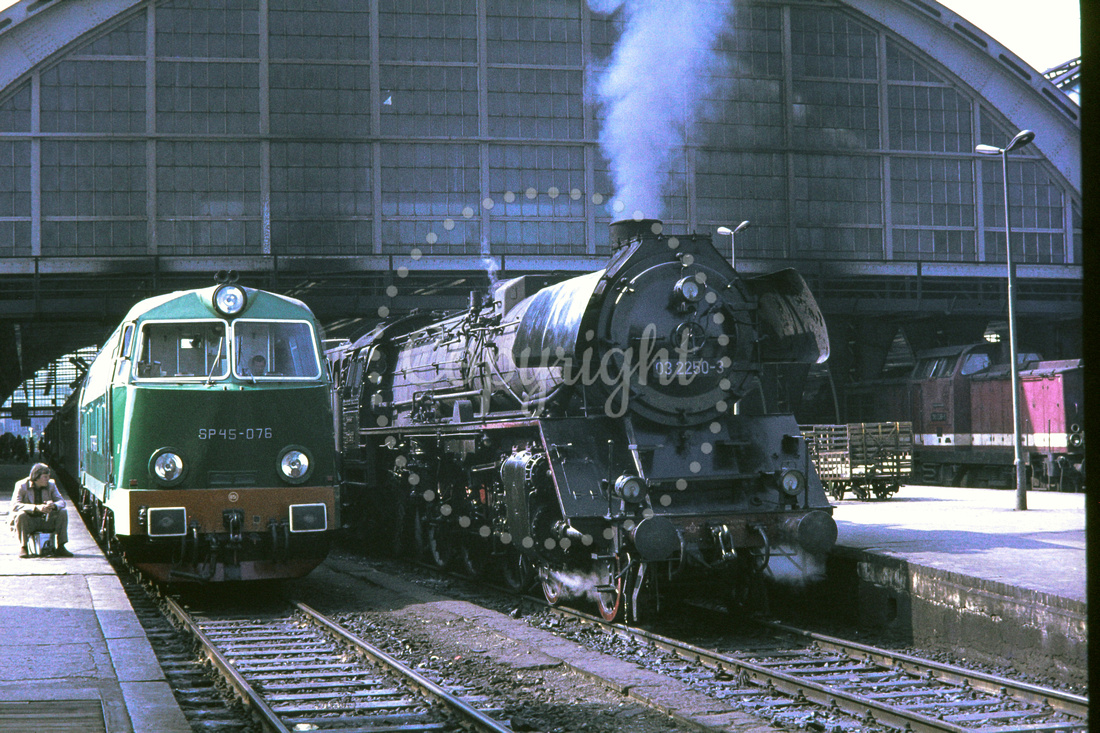 GHT12055 - East Germany DR class 03 - 4-6-2. 03 2250-3 at Berlin Ostbahnhof station. Builder Krupp 1569-1936 - Allongside PKP SP45-076 (22.07.1975) - GH Taylor.