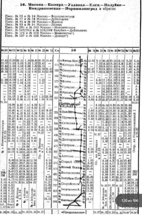 Так есть краткое за 1974 г.ЕвРо:Жаль, что книга Расписаний по Ю.ж.д. только за 1971 г. Там 20 час, но смен бригад столько, что "ни в сказке сказать..."Владимир Дукин: в 1973-1975 гг 15/16 Москва-Ворошиловград ходил за 17,5 часов