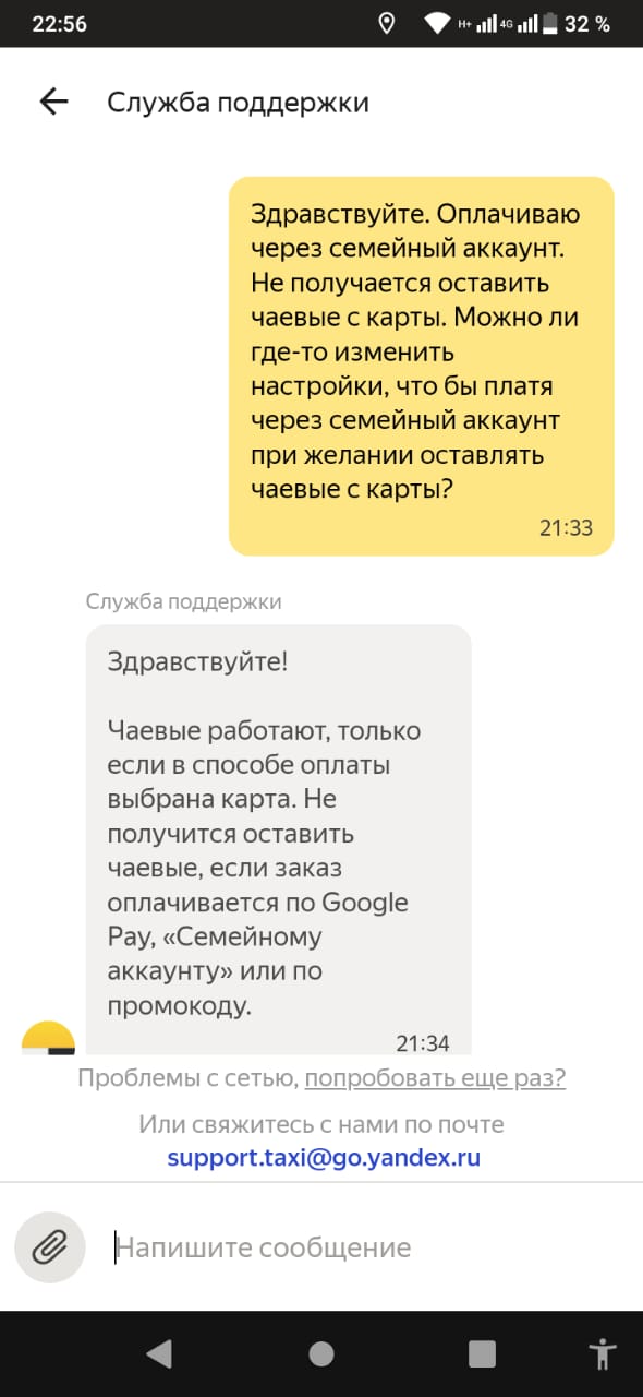Если делаешь оплату через семейный аккаунт, то безнальные чаевые оставить не получается. Яндекс это менять не хочет.Колхозник:я заметил, что если пассажир их оставляет во время поездки, то они приходят сразу после ее завершения. В остальных случаях стали приходить на след день. Чего раньше не наблюдалось. Да и сами чаевые практически перестали оставлять с безнальных заказов ( раньше мне оставлял каждый пятый пассажир, сейчас 1 из 20). С заказов за нал по к+ сдачу пока еще большинство не беретmistaa: как скоро они приходят?