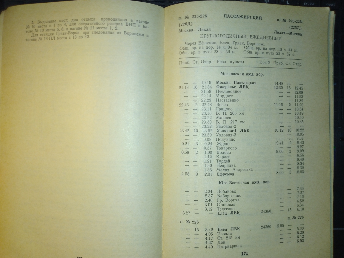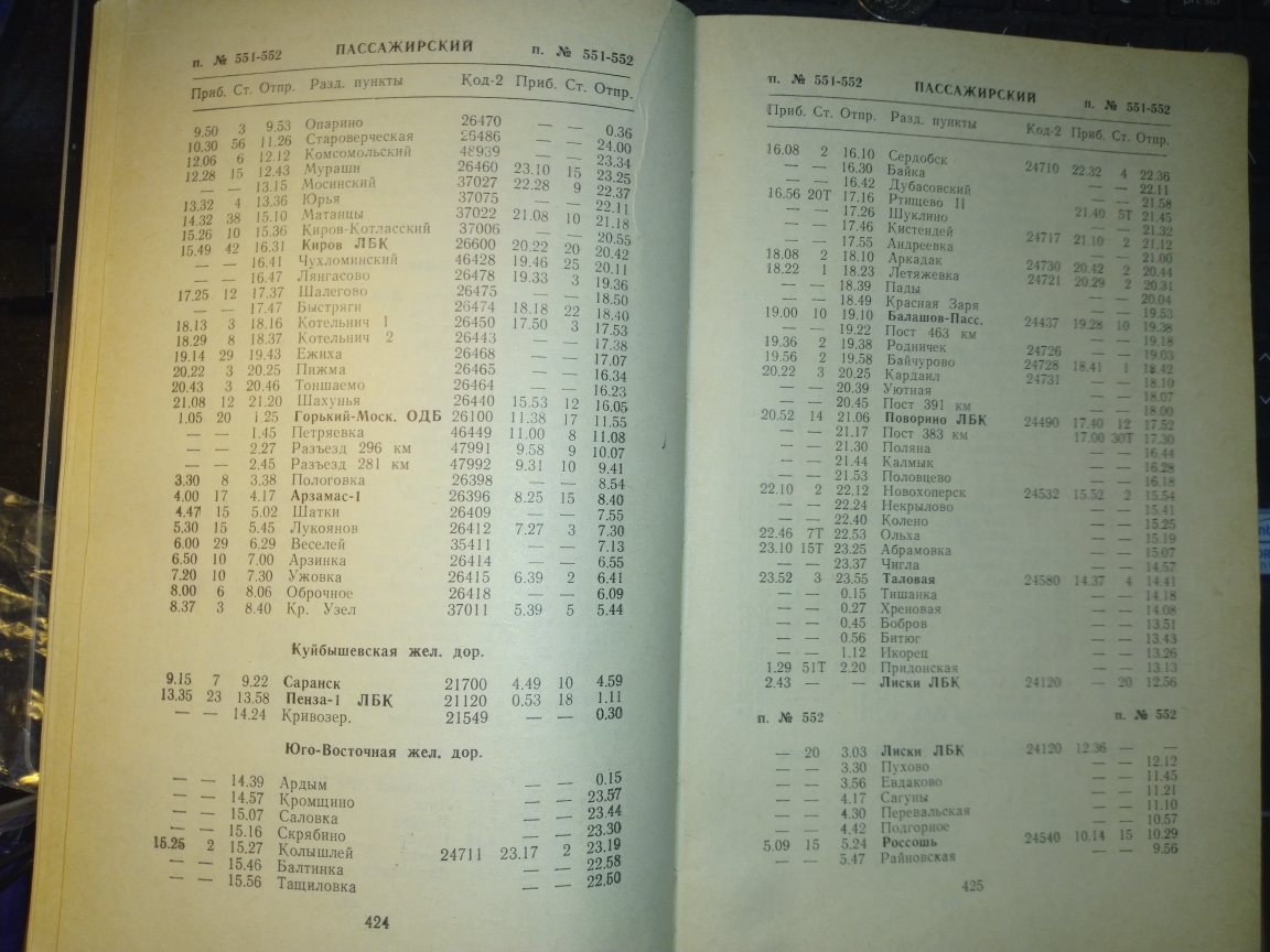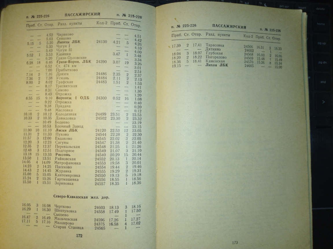 За 1988 год в книге вообще ничего не сходится. Там, к примеру, поезд 237 от Горшечного до С.Оскола время 1 час пути висит, зато по участку Купянск-Сватово отрицательное время, т.е. прибывает в Сватово в 17.21, отправляется в 17.09)). По служебке Донецкой прибывает в 17.03, но в по Купянску у него время 16.02-16.19.