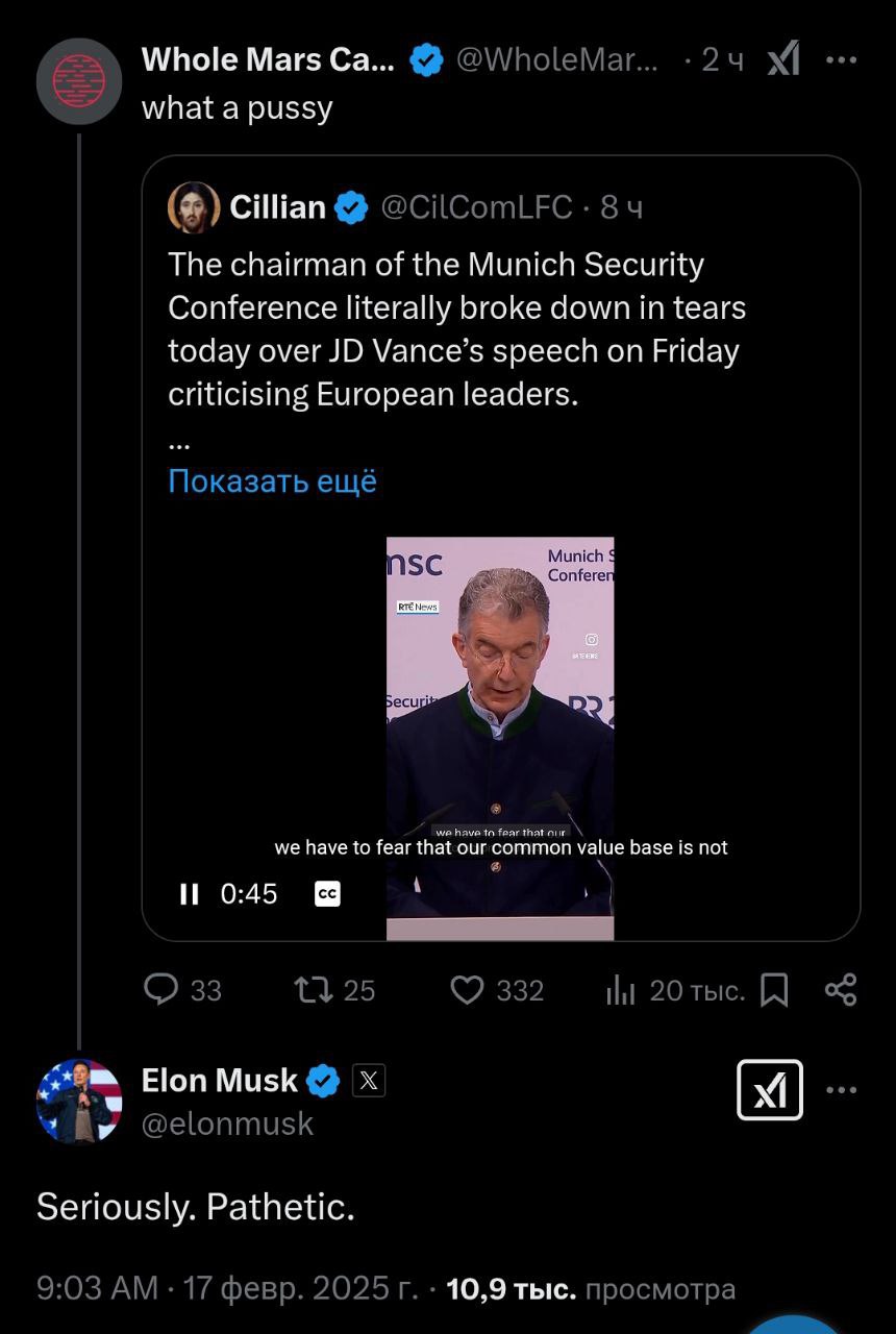 Маск назвал «жалким» главу Мюнхенской конференции по безопасности Кристофа Хойсгена, который не смог сдержать слез во время речи на закрытии мероприятия
