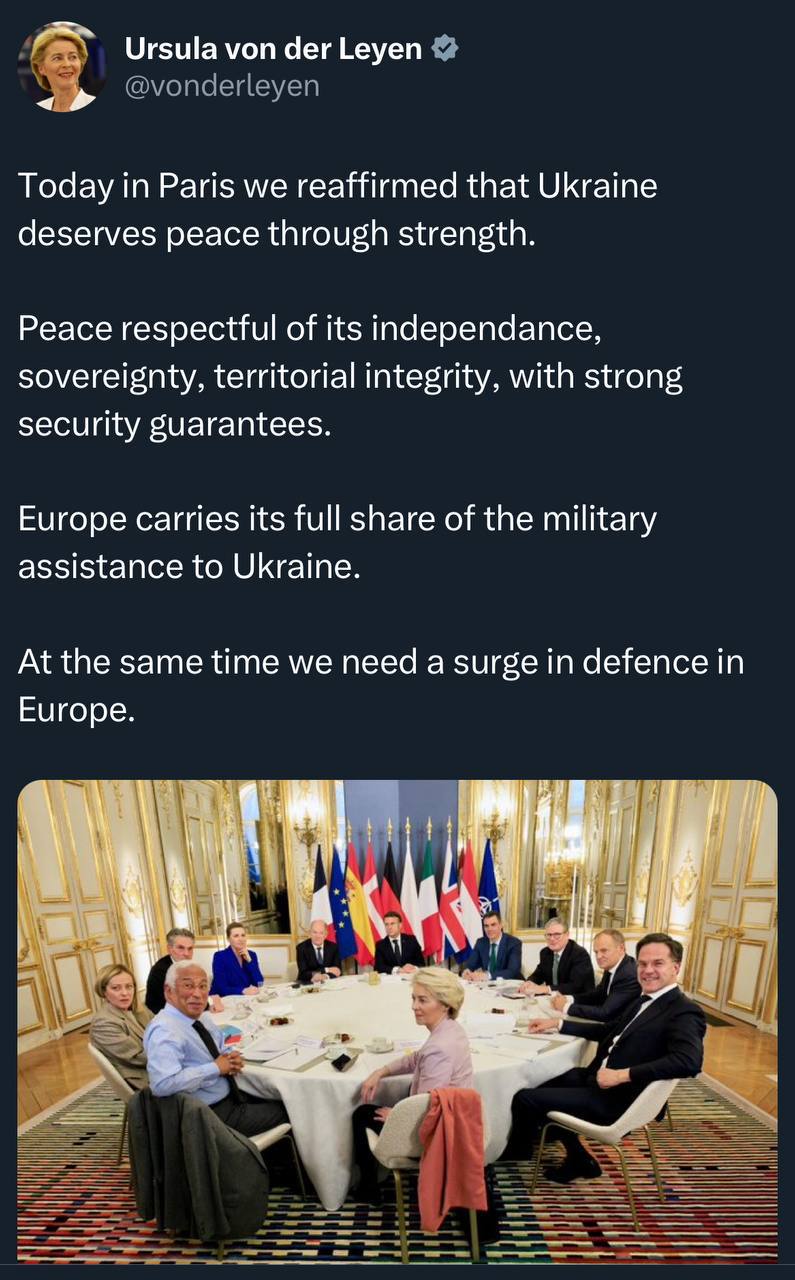 Поражение стратегическое им нужно, и 1945 год они не могут простить. Европа снова в полной мере нацифицирована, и это относится к обычным гражданам в том числе. Во Франции, когда СВО уже была в разгаре и экономика Франции пошла в рецессию - выбирают Макрона, а потом, в парламент - первое и второе места забирают русофобы - меланшоновцы и макронщина. Сейчас выборы в Германии, и по опросам, на первом месте - ХДС с Мерцем во главе, который открыто поддерживает нынешнюю политику, а АДГ набирает только около 20-25%, и то, преимущественно, на востоке (бывшая ГДР). В Британии, кто бы не пришел - таже политика, правда, там выбирать не из кого, как и в Польше. В других странах ЕС-НАТО также дело обстоит, включая братушек-болгар, и только граждане Венгрии и Словакии сказали "Нет фашизму", ну и Хорватия занимает неагрессивную позициюLmV: Т.е. поняли: о чём в Швеции и Мелкобритании мечтают? Чтоб Россия, фактически, была разоружена (ну или близко).