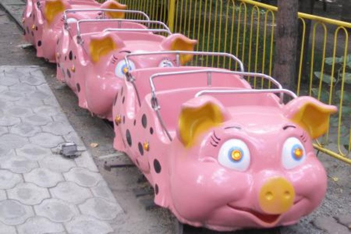 "На каждой тележке должен быть установлен вагончик в виде поросенка, который крепится болтами к борту тележки", - говорится в документации торгов. К техническому заданию приложено изображение аттракциона (см. ниже), который хотят купить.