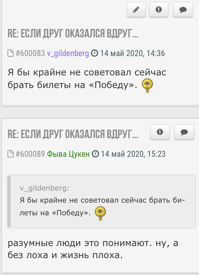 Теория оказалась верной. В группе Победы вк люди, накупившие билеты по дешевке в Сочи/Анапы/Волгограды, теперь жалуются на отмену рейсов в июнеseregathebest » 13-05-2020, 17:10:если есть лишние и не сильно нужные деньги, то можно и купить. Сама компания-то никуда не денется, пришлют ваучер в худшем варианте. Русская рулетка так сказатьКолхозник » 13-05-2020, 16:31:так что не интересоваться нужными направлениями?