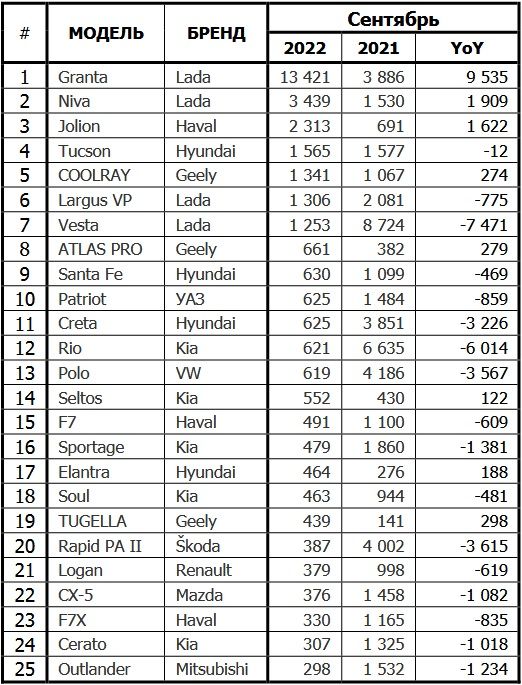 В сентябре 2022 года общие продажи новых автомобилей в России составили 46 698 штук, что на 60% меньше, чем в сентябре прошлого года. Доля АвтоВАЗа на рынке в сентябре составила 44% за счет Lada Granta, уверенно занимающей первое место с гигантским отрывом. Стоит также отметить появление в сентябрьском рейтинге на разных позициях моделей Hyundai-KIA, которые смогли собрать на Автоторе в Калининграде до исчерпания машинокомплектов. Традиционные лидеры (Solaris, Kia Rio и Hyundai Creta) пока сохраняют место в итоговой таблице, но только за счет машин, собранных до марта 2022 на заводе Hyundai в Санкт-Петербурге.