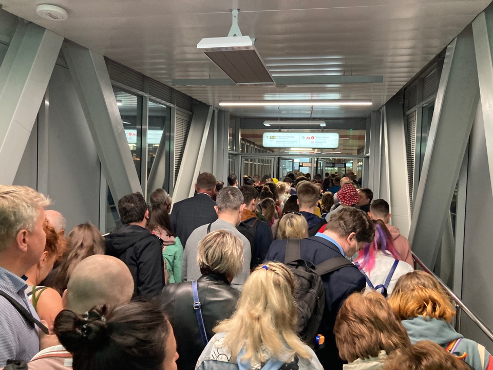 Я, конечно, не знаю что там за засор, но когда я был - приехала сдвоенная дрыгалка из Горького, все быстренько рассосались. При входе с 9 пути, хер знает какой он там по их навигации, досмотра вообще не было, в конкорсе обычный МЦКшный, т.е. выборочный с большими баулами.