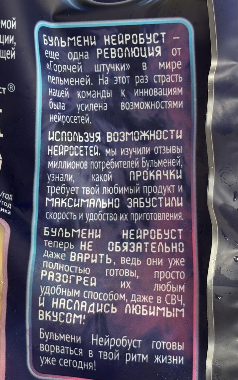 Извините что не по теме. Но вот. Что нам сообщает ИИ !? Что эти пельмени не надо ВАРИТЬ :=-O: То есть, люди сами до этого не додумались, а за них додумалась нейросеть (если верить маркетинговой легенде). В общем, маркетологи или молодцы, или рискуют потерять работу в скором будущем. Спасибо ПродуктМедиа за фото.