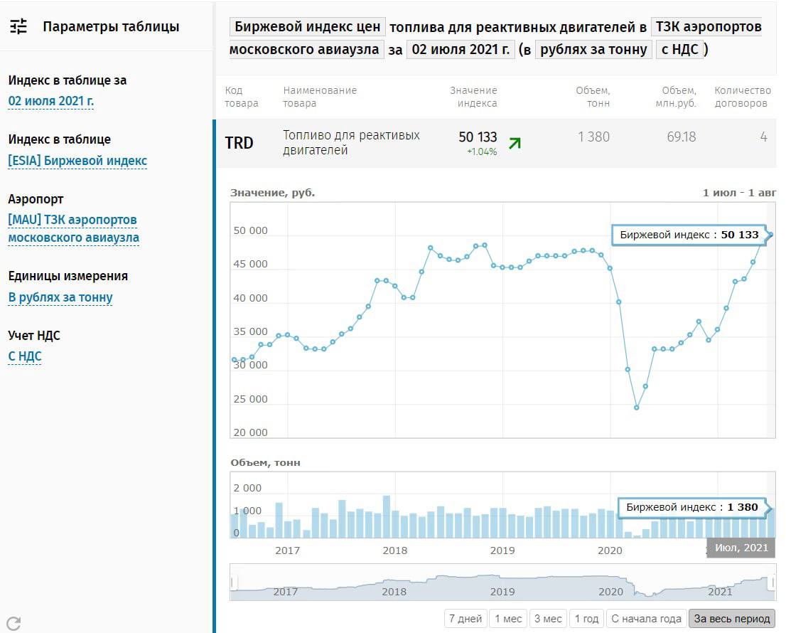 ….биржевая стоимость авиатоплива в топливозаправочных комплексах московских аэропортов достигла исторического рекорда и впервые превысила ₽50 тыс. за тонну