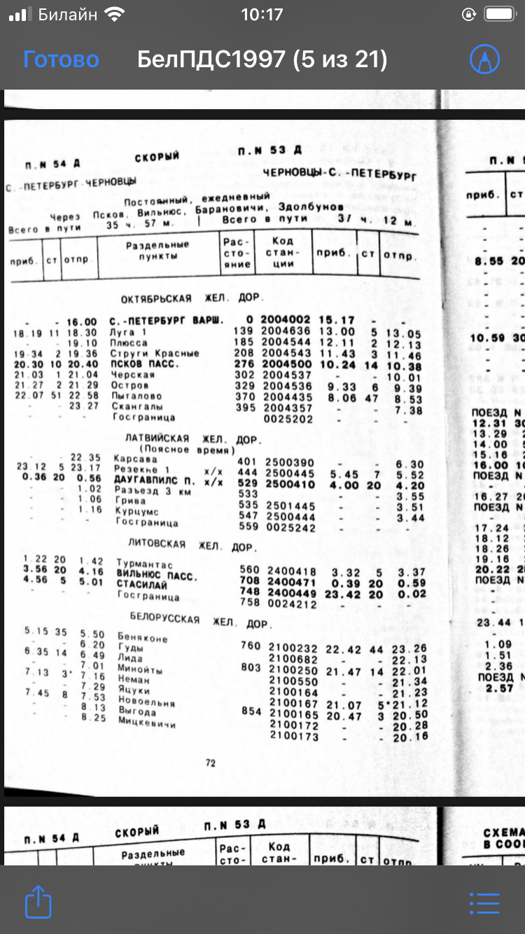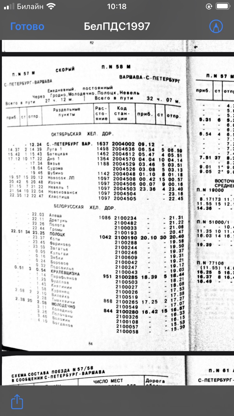 В электронном нет, к сожалению. Посмотрите тут на форуме в ветках «служебные расписания» и «расписания прошлых лет»ЕвРо:А есть ли расписания этих лет (1994, 1995 гг.) в электронном виде?Минеральные Воды: Ну вон выше привели 1994. 1995 так же, 1996 49/50 уже с Витебского, 189/190 в обе стороны через Псков-Лугу. При Союзе 189/190 вроде шёл прямо, без объезда Прибалтики. Ещё 673/674 в одну сторону был через Котлы