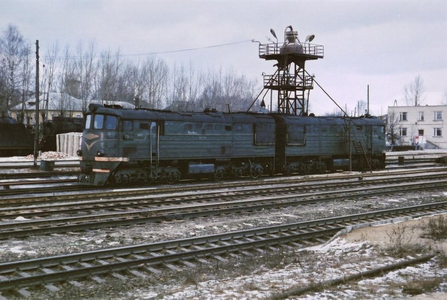 Тепловоз ТЭ3 на станции Резекне-2, Латвия (23.01.1991):