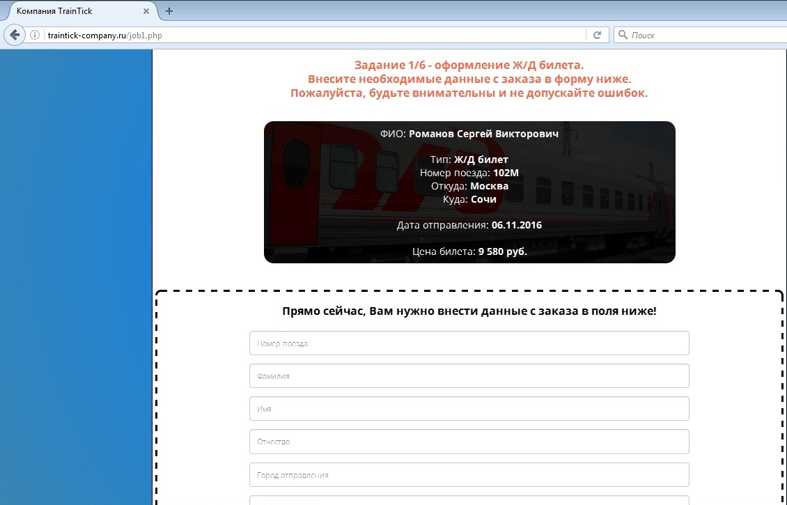 После этого прокрутил сначала. Все данные, номера поездов, фамилии "пассажиров" были теми же, что и в первой серии. Прощелкав заказы, дошел до регистрации, зарегистрировался на "мусорный" почтовый ящик. Потом мне написали, что проверка моих данных стоит сколько-то рублей (300 что ли), которые можно оплатить картой или Яндекс.Деньгами. После проверки обещали перевести заработанные 12000 рублей. Конечно, 300 рублей я оплачивать не стал.