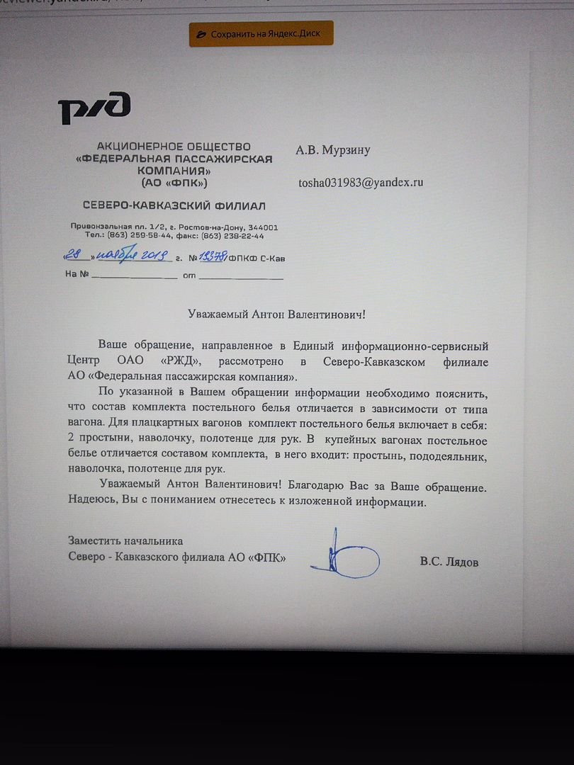 Возмутила ситуация с постельным бельем в 2019 году в поездах ФПК. На 4 поездки в не фирменных, дополнительных поездах, только в одной поездке соблюдали нормы распоряжение ОАО "РЖД "от 30 декабря 2009 г. № 2751р Об утверждении «Норм оснащенности спальных пассажирских вагонов съемным мягким имуществом». , было, как положено, пододеяльник, простыня, махровое полотенце, наволочка, это поезд 536А/535С Смоленск - Брянск - Анапа. ... В остальных случаях, на поездах 481/482; 511/512; 459/460 - были комплекты для плацкартных вагонов, то есть две простыни вместо пододеяльника. Накатал жалобу еще в июле, при поездке на 481 поезде в Москву, дабы ситуация изменилась в поездке поездом 511 в Сочи. 30 дней им отведено для ответа. И вот, что прислали, во вложении, я спрашивал, почему нет пододеяльников в купейных вагонах. Ответ... Почитайте сами... Теперь, спустя 6 месяцев, был повторный запрос в группу VK, ОАО РЖД. Спрашиваю уже грубо, ибо туда писал дважды по тому же вопросу. Вопрос больше к юристам - а мне за обвинении в коррупции ничего не будет?