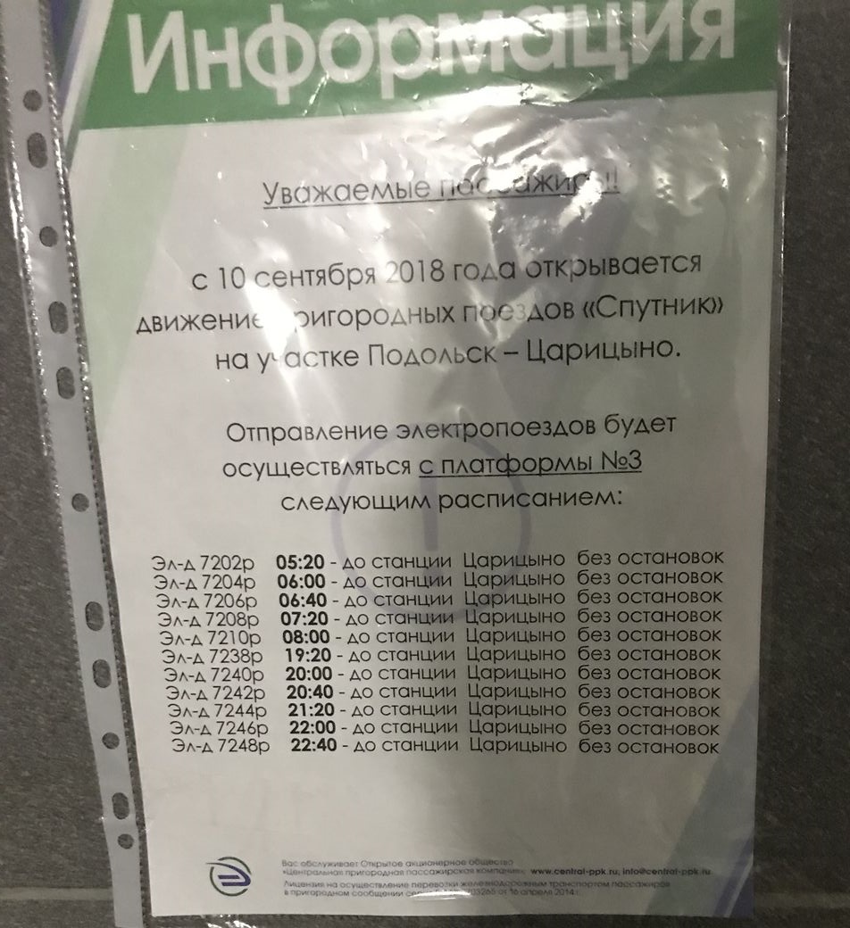 Ну что!? Маршрут ЦППК «Подольск - Царицыно» обкатан. Два раза. Впечатления. Первое - новая электричка ЭП2Д да мало народу. Информирование в Подольске и в Царицыно ведётся активно , но народ на электричку явно толпами не ломится. Время отправления было 06-00 утра из Подольска. Первый раз поехало человек 40, второй 60-70. Ну посмотрим. Возможно виной тому есть реконструкция тоннеля под железнодорожными путями на ст. Подольск из-за чего попасть на платформу 2 (старую островную ) можно с привокзальной площади, минуя турникеты (многие этим и пользуются ) . Сесть можно теперь на классическую электричку без билета и доехать до многих платформ, которые неоттурникечены легко. На этот так называемый спутник турникеты стоят в туннеле перед лестницей на подъем и кроме абонементников , любителей и просто честных и хороших граждан никто не идёт на эту электричку. Возможно такой же честный гражданин хотел бы доехать из Чехова на этой электричке до Царицыно с пересадкой в Подольске, но я не знаю как ему быть с билетом ? Заново платить !? Думаю руководству надо проработать этот вопрос ! Лично мне стало удобнее можно гарантировано посадить свою пятую точку после 7 утра! Обычно в это время если уезжать - то стоя. Касаемо выхода в Царицыно. Северная часть платформы 4 в Царицыно - тропа народная ведёт через этот рынок. Рынок есть рынок : лужи, грязь. И сразу не догадаешься куда идти надо до метро. Сухая пересадка, понятное дело, уже невозможна . Южная часть платформы 4 Царицыно прибытия этого экспресса лучше : там тропа ведёт на пешеходный мостик над железной дорогой и лайфхак от меня - надо не ленится и заходить на станцию метро Царицыно через северный вестибюль ! Соответсвенно нужно также выходить чтобы на этот экспресс садится . Я думаю так дольше зато удобнее! Грузовые поезда. Ездят по 3,4 главному постоянно. Не знаю как там их собрались убирать. Видимо компромисс будет какой -то. В целом, да езда понравилась . Шероховатости есть - но это все излечимо . Будем наблюдать !