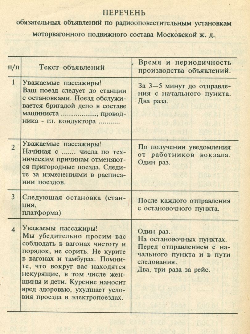 В служебках МЖД (Савёловский пригород) откопал прилагаемый "весь оглашенный список" звукового спама, аж из 15 пунктов. Однако, пользуясь электричками данного направления всю жизнь, никогда не слышал, чтоб все это полноценно исполнялось.
