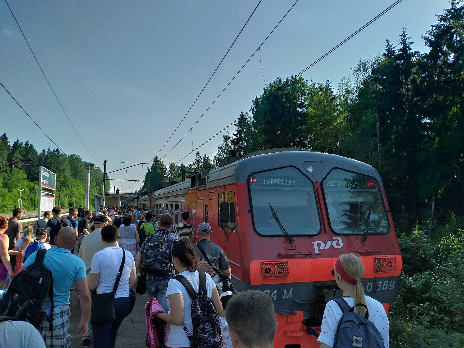 Сколько туда набилось народу - видно по фото. Там же и пассажиры с детскими колясками и велосипедами заходили, и кто-то с велосипедами/колясками уже ехал в тамбурах, так что посадка сильно затягивалась. К Девяткино подъезжали уже довольно плотно забитыми, но по проходу можно было даже пройти между тамбурами. Вот вечером в воскресенье, когда помимо отдыхающих ещё и дачники активно возвращаются, уже было бы совсем забито, как в "Карелии" ЭТ2ЭМ-003 несколько недель назад, пока она была шестивагонной, правда, у неё и тамбуры гораздо меньше, чем у 369-ой, и переход межвагонный другой совсем. Где-то выше обсуждалось, что более короткие маршруты на этом направлении (с конечными в Сосново и Васкелово) пользуются большим спросом (хотя, лично я с этим не очень согласен) -- так вот шестивагонка эта как раз шла из Сосново, а не из Приозерска-Кузнечного.